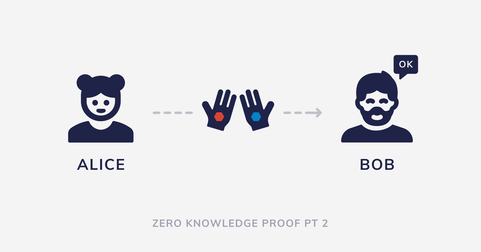 Every time Alice challenges Bob, she gets a response. With enough responses she can be statistically certain that Bob can see colors. Every challenge/response is called an interaction. In this case, Alice needs a set of interactions to be performed before she is certain that Bob can see colors. Zero Knowledge Proofs can also be non-interactive, which does not require the effort of a challenge-response interaction and also allows multiple parties to verify Alice’s claims, not just Bob.